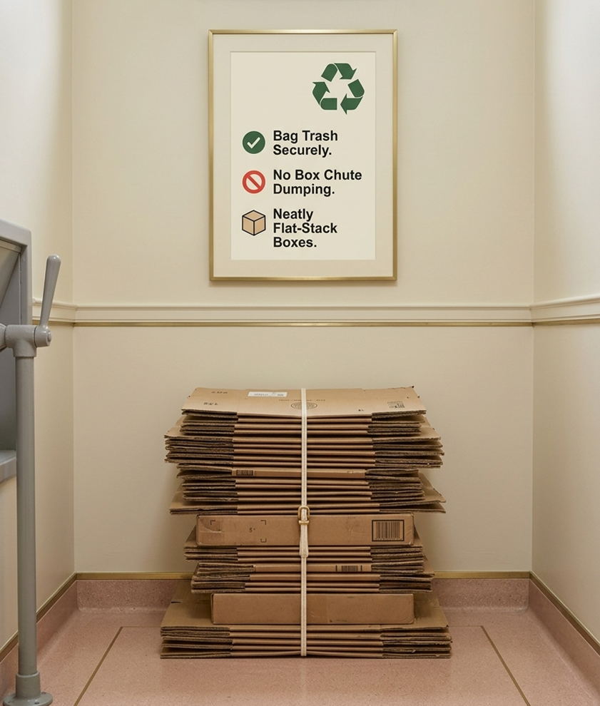 Maintaining a clean and safe environment at The Blake at Berkeley starts with simple trash and recycling etiquette. To keep our community spaces organized and our equipment functioning properly, please ensure all garbage is securely wrapped in plastic bags before using the trash chute. We also ask that you never place large items, objects, or boxes in the chute, as these can cause significant blockages; instead, please break down all cardboard boxes and leave them stacked neatly inside the trash room for our maintenance team to collect and move to the main disposal area.